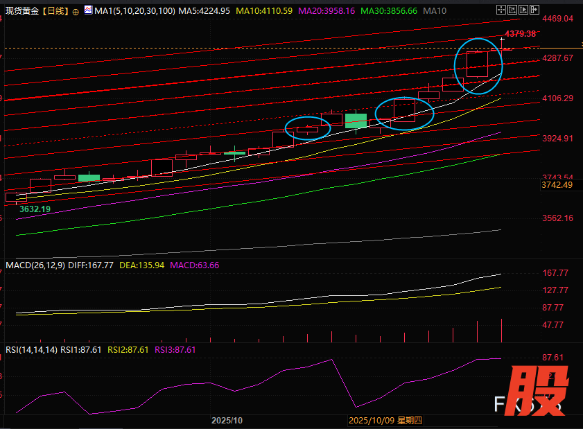 现货黄金日线图显示,现货黄金这波上涨一直在加速,蓝圈显示现货黄金从三天两通道,三天三通道到这波的三天四通道,金价从3天涨120美金到三天涨200美金到这次的三天涨230美金。