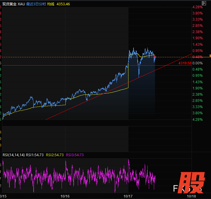 汇通财经APP讯——周五(10月17日),亚欧时段,现货黄金走出探底回升V型反转的走势,盘中一波下跌2%,约100美金,之后快速收复失地,目前交投于4333附近,上个交易日的周四黄金则加速上涨了130个点涨幅2.8%。同一时段现货白银也走出了探底回升的走势,盘中一度跌约100美分之后收复全部失地,周四白银上涨了2.1%。